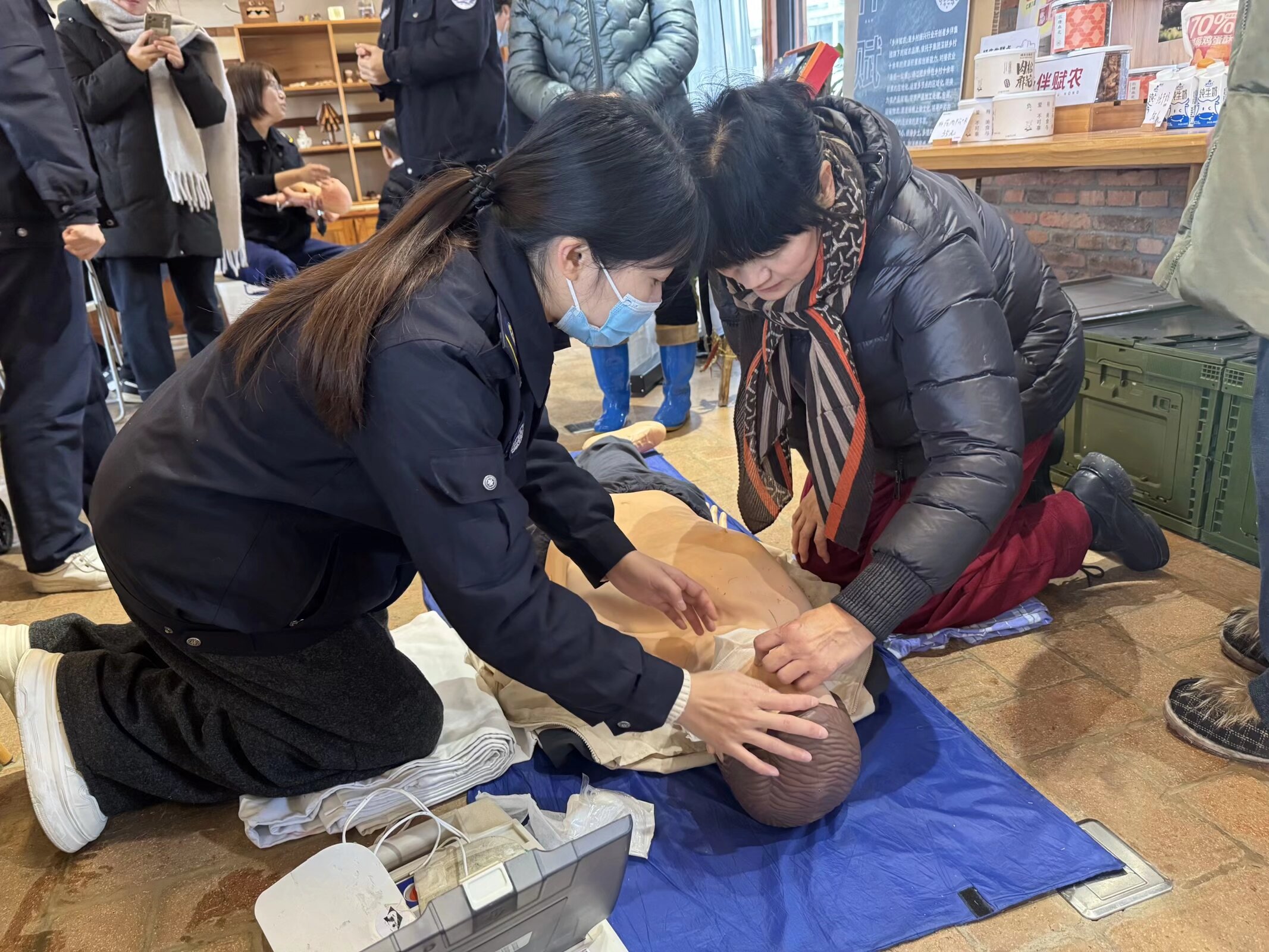 此外,护士长余梦云逐一讲解心肺复苏、海姆立克急救法、AED使用等关键技能,边演示边讲解,吸引了大批游客驻足。不少游客举起手机拍摄教学视频,还有些游客们陆续上前体验实践。